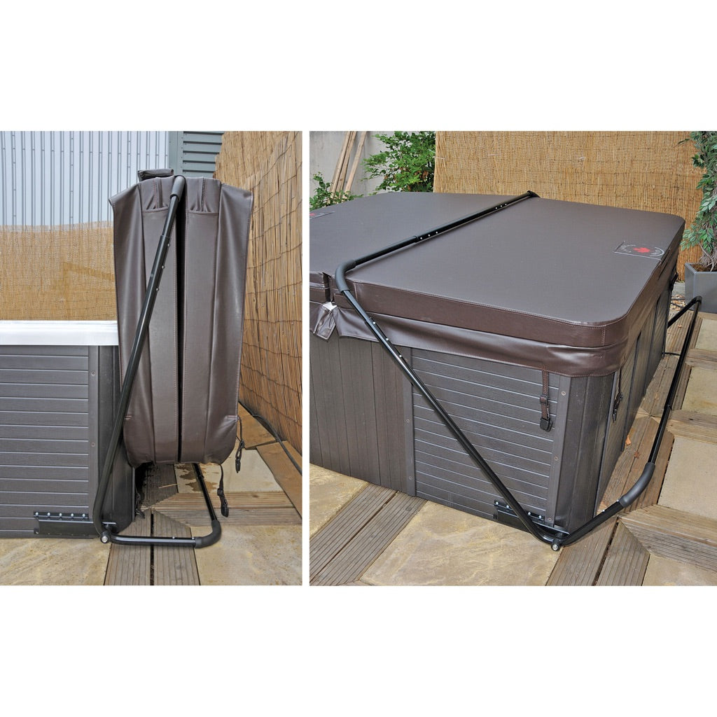 Eliminate the hassle of removing your hot tub cover with a Canadian Spa Company cover lifter! It makes cover removal and replacement a quick, one-handed operation while reducing wear and tear. This cover lifter mounts to the sides of the hot tub with durable brackets that attach to the spa itself. Clearance of 18 in is required behind the spa to ensure that the cover is stored safely and with minimal effort. A towel holder bracket is also included on the cover lifter arm so you can conveniently keep your towel close by.
