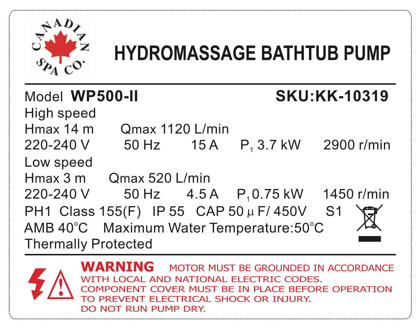 WP500-II 5HP 2 speed pump. Includes 4-core cable with fitted AMP plug and pump unions for 2.5in suction and 2.5in discharge.