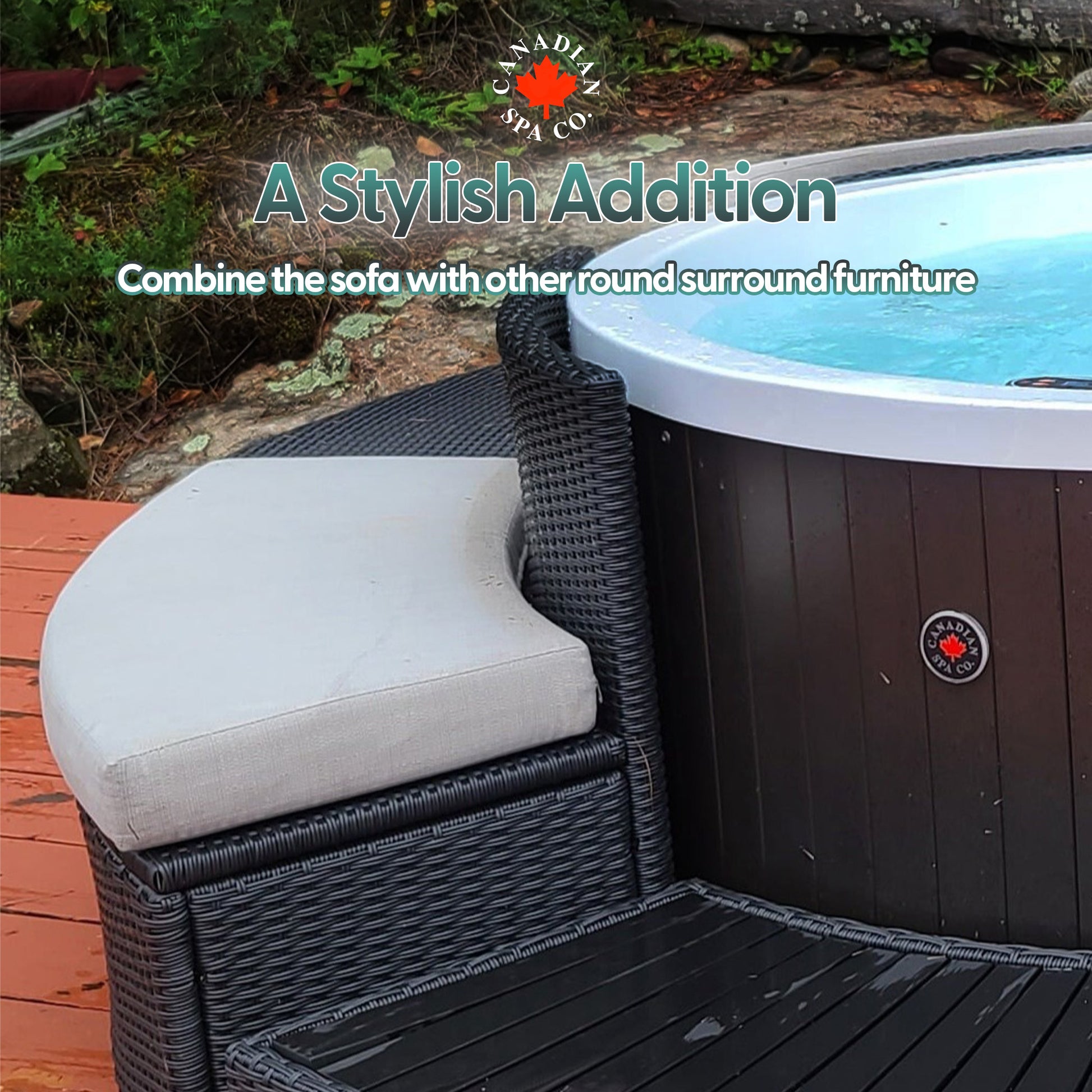 Relax on the sofa while your friends and family enjoy the spa! The love seat features an attractive wicker finish, constructed of a durable, weather resistant, synthetic rattan. The seat cushion is upholstered with a comfortable, UV protected canvas. Designed to be used alongside other items from the spa surround furniture collection to create the ultimate outdoor oasis that perfectly surrounds your 72 in to 84 in diameter circular spa. Care Instructions: Your outdoor furniture can quickly and easily be cleaned by spraying it down with a hose. When you want a more thorough clean, wipe frames with mild detergent in luke warm water. Rinse with clean water and let dry thoroughly. Avoid strong detergents and abrasive cleaners. Recommended: Store away cushions when not in use. Although resin wicker is incredibly durable, we recommend that you use a protective cover when your furniture is not in use to help keep it looking new.
