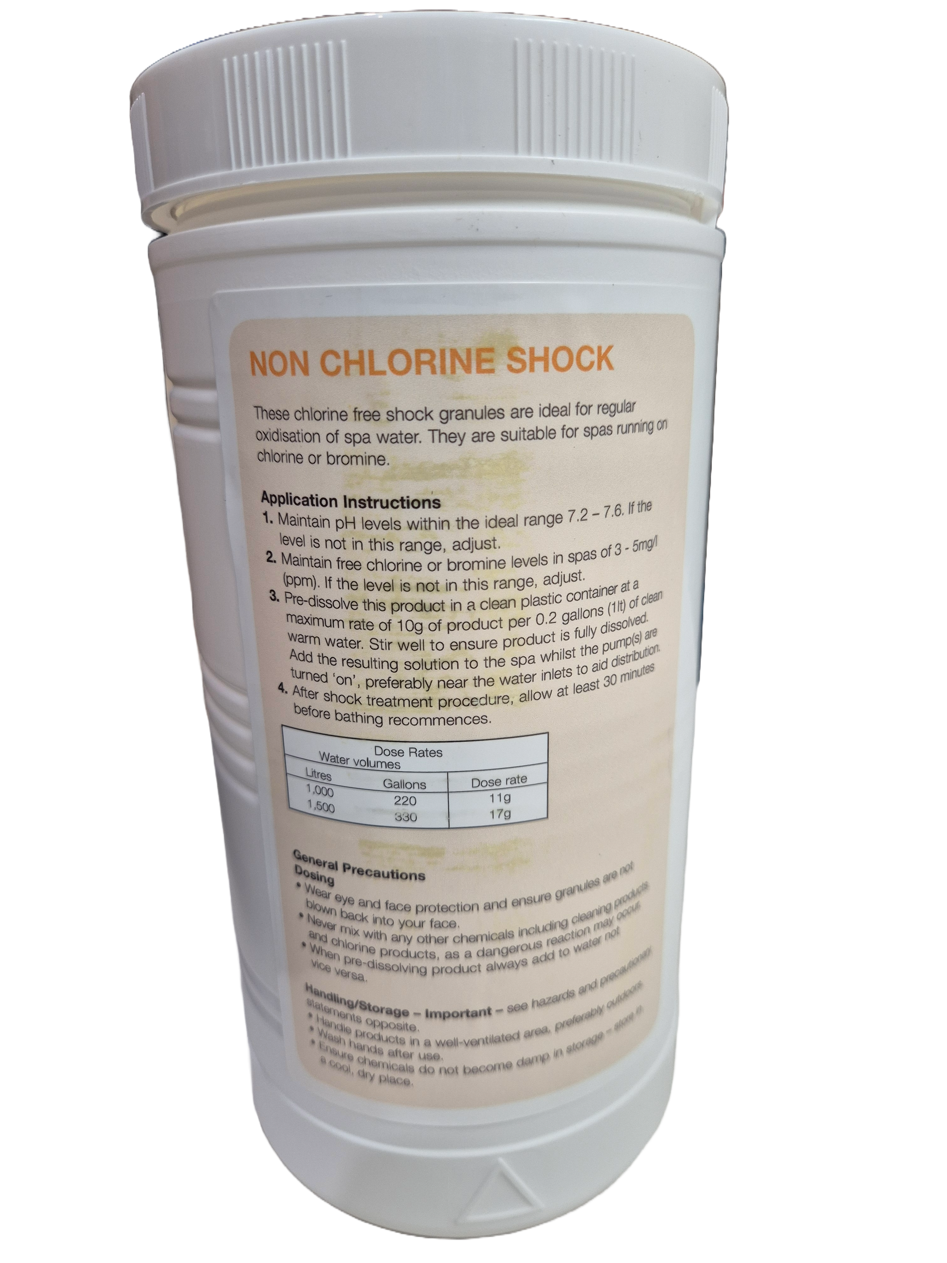 Restore clarity and freshness to your hot tub with our premium Non-Chlorine Spa Shock. Specially formulated to oxidise and break down organic contaminants that are not removed by your filter, this shock treatment refreshes and reactivates your existing sanitiser, helping to maintain crystal-clear, hygienic water.