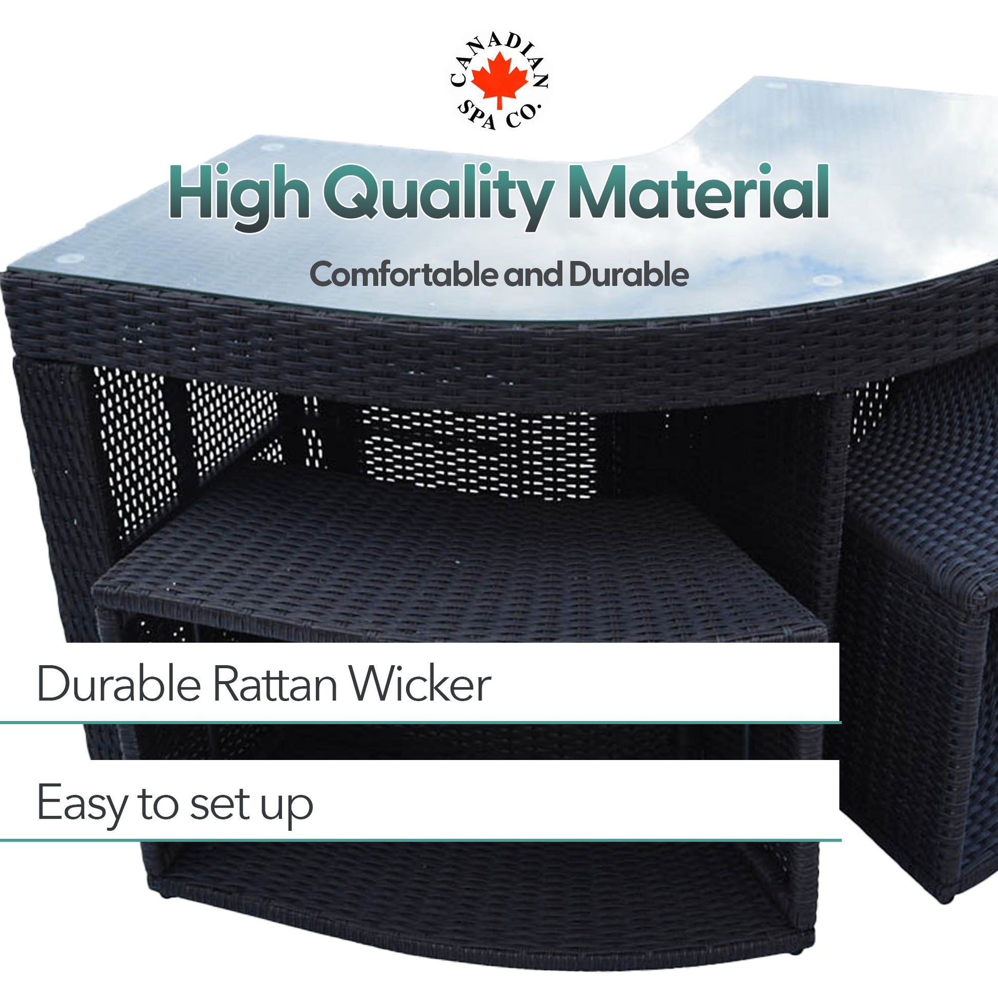 This Bar Table is designed to be used alongside other items from the Square Spa Surround Furniture collection to create the ultimate outdoor oasis that perfectly surrounds your square or rectangular spa. It features an attractive wicker finish, constructed of a durable, weather resistant, synthetic rattan over a rust-proof, heavy-gauge aluminum frame. It includes a tempered glass-top allowing you to conveniently relax in the spa with a drink by your side.