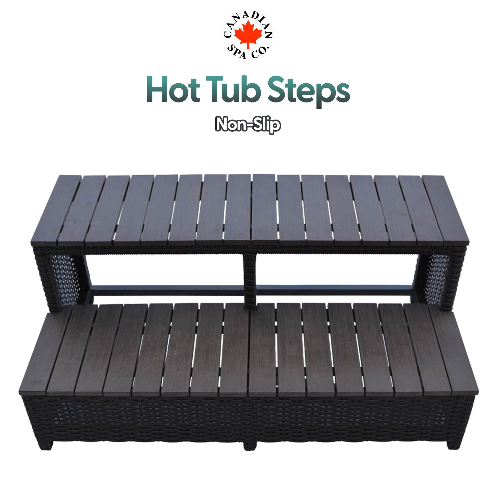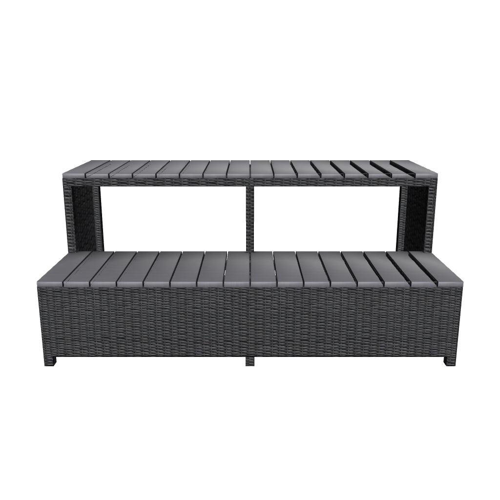 The Wicker Spa Step features double steps constructed of a slip resistant synthetic wood with an attractive wicker rattan finish along the border of the step. Multiple steps can be combined with our Square Spa Surround Corner Steps to create a wrap around effect around the perimeter of your spa.