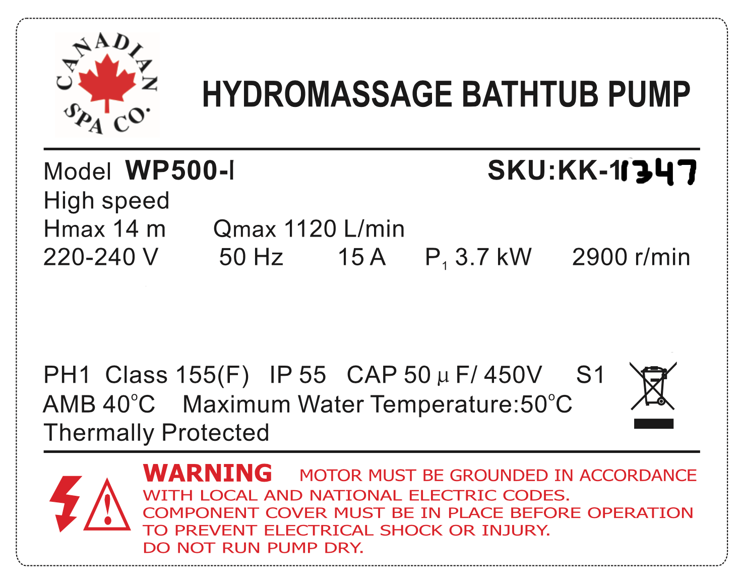 WP500-I 5HP Single speed pump. Includes 3-core cable with fitted AMP plug and pump unions for 2.5in suction and 2.5in discharge.